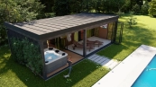 Az alumíniumtokos hőszigetelt harmonikarendszereknek köszönhetően a melegebb hónapokban teljesen nyitott, míg a hidegebb hónapokban zárt lehet a wellnessház.