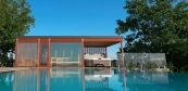 A wellness teraszhoz modern stílusú szaunaház, tágas medence és kényelmes pihenő tartozik hangulatos fényekkel és fedéssel.